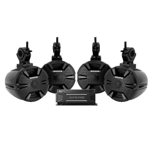 600W Sound System Upgrade • Includes (4) Weather-Resistant (IP55 Rated) 6.5” 2-Way Coaxial Speakers Enclosed in Fiberglass Speaker Pods with Folding-Style Clamps that fit 1.5”-2” Rails • KTA-30FW 4-Channel Weather- Resistant (IP66 Rated) Power Pack Amplifier (75W RMS x 4 @ 2Ω/ 4Ω, 150W DPP x 4 @ 2Ω/